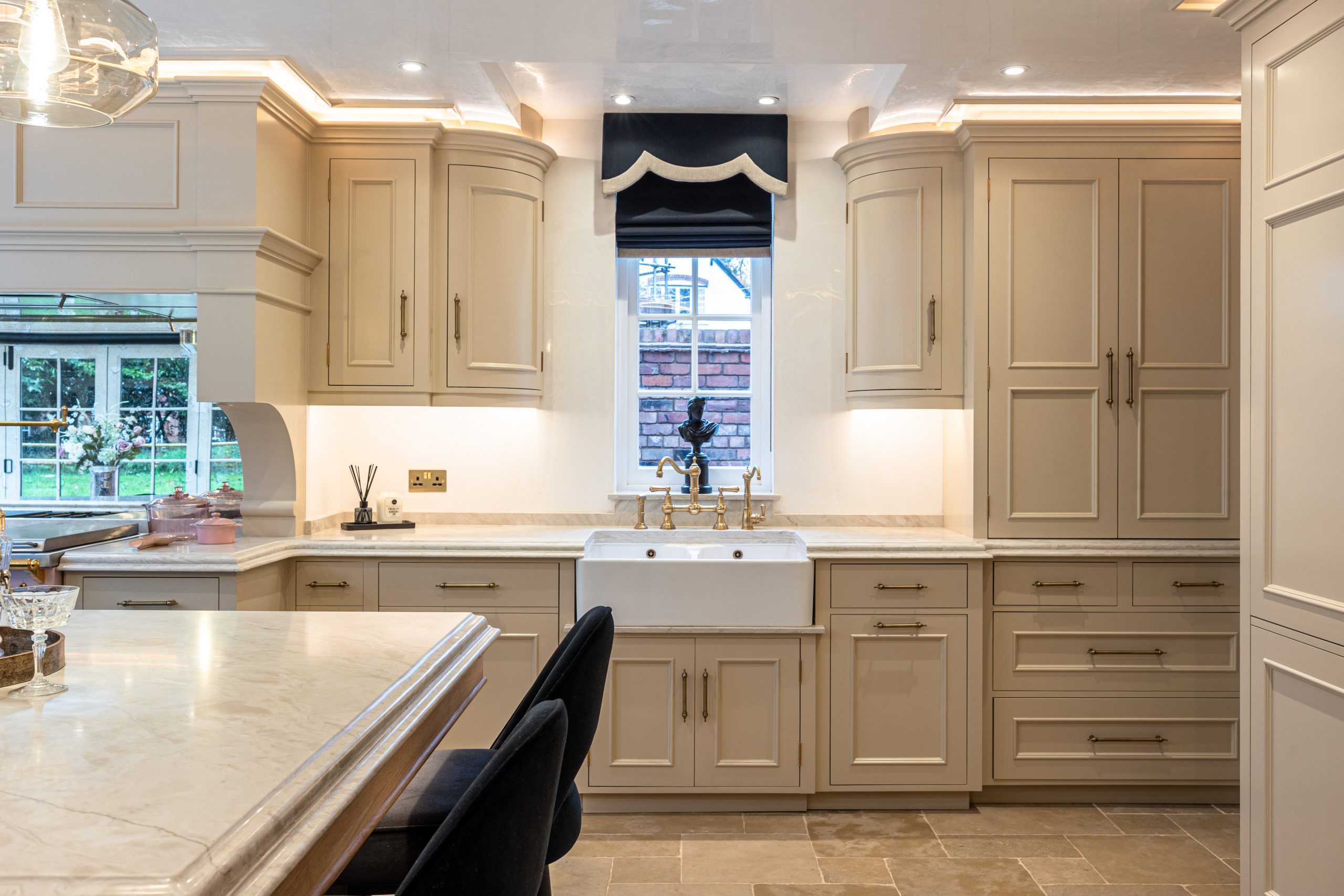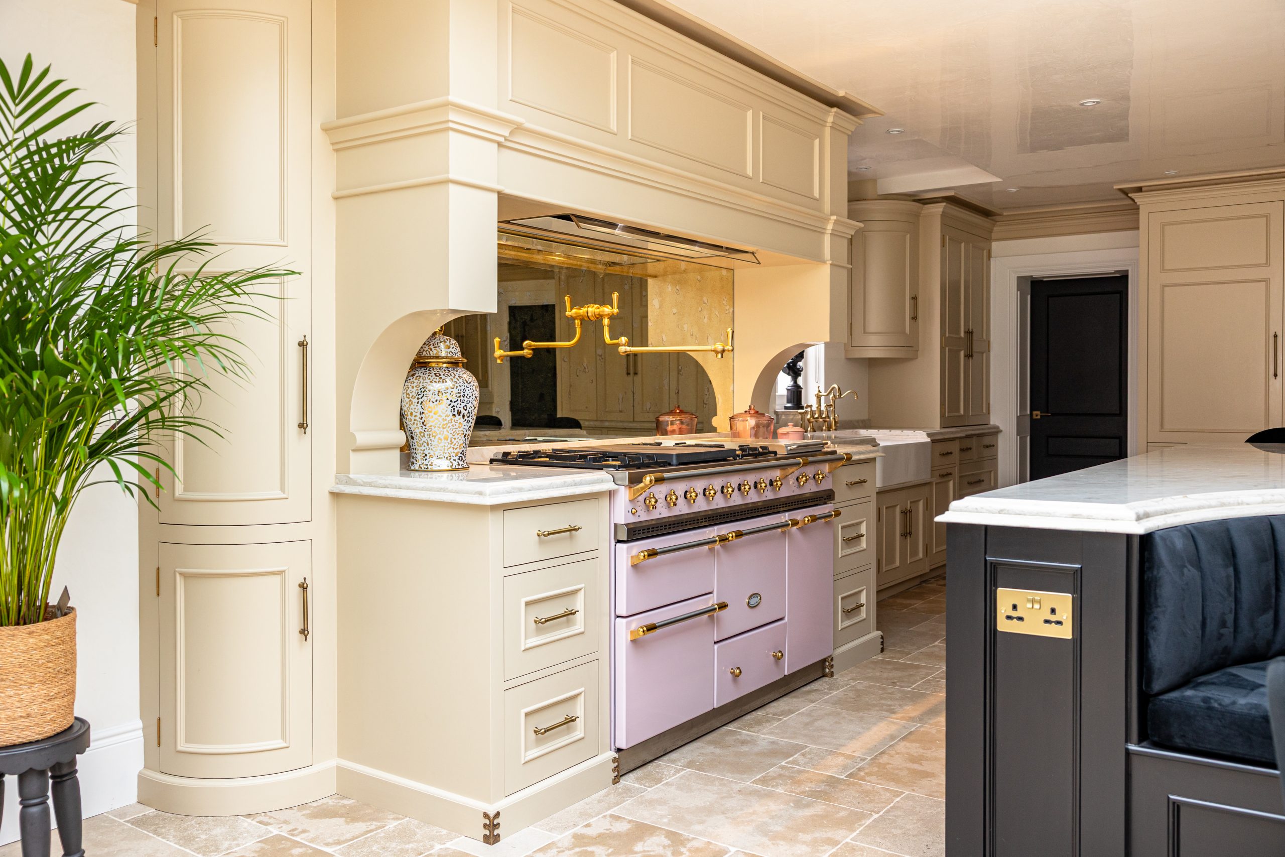 The rose-quartz 1400 Lacanche cooker introduced a truly distinctive focal point, its soft hue beautifully complementing the black island and stone-coloured units, all unified by the warm, luxurious tones of Taj Mahal quartz.