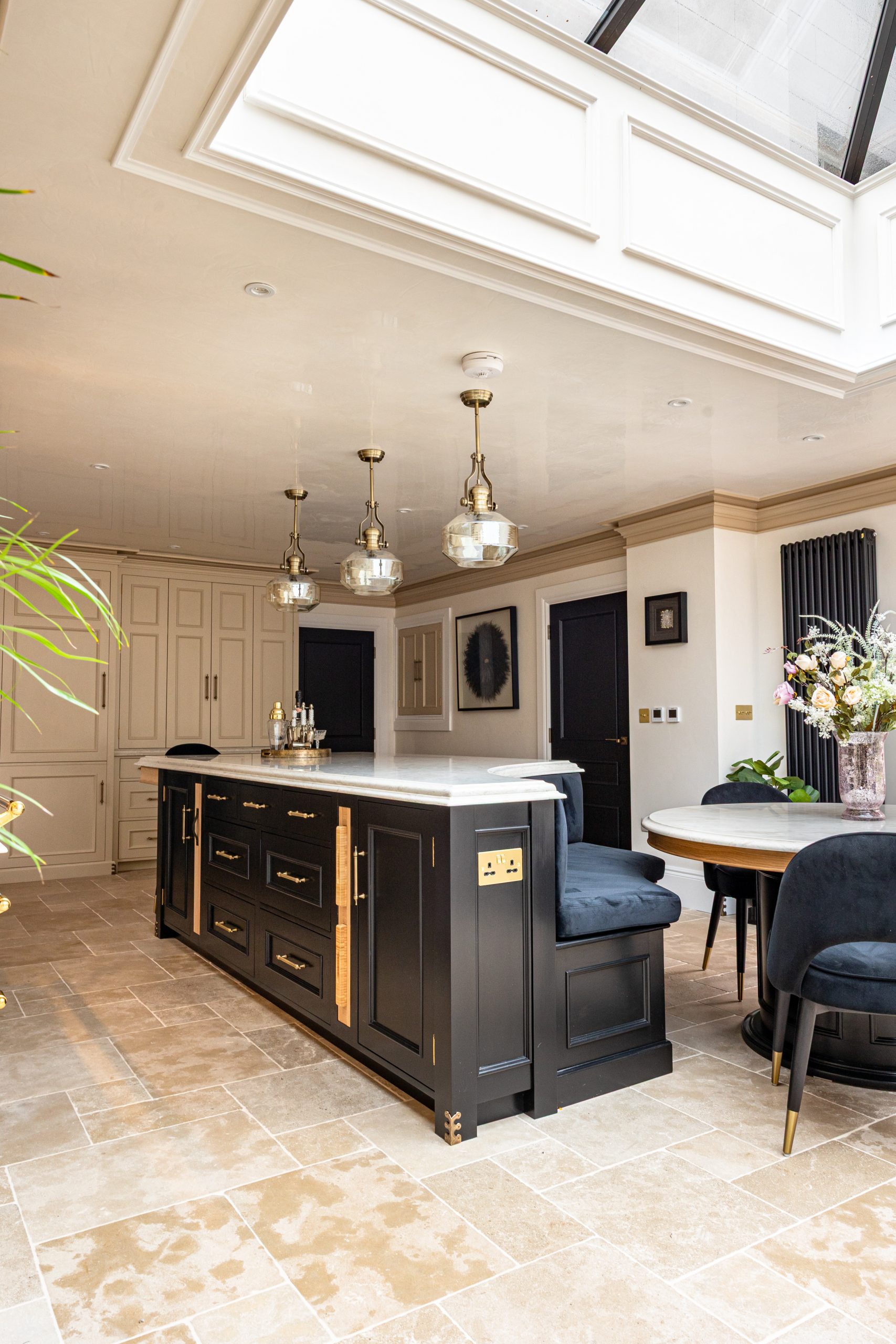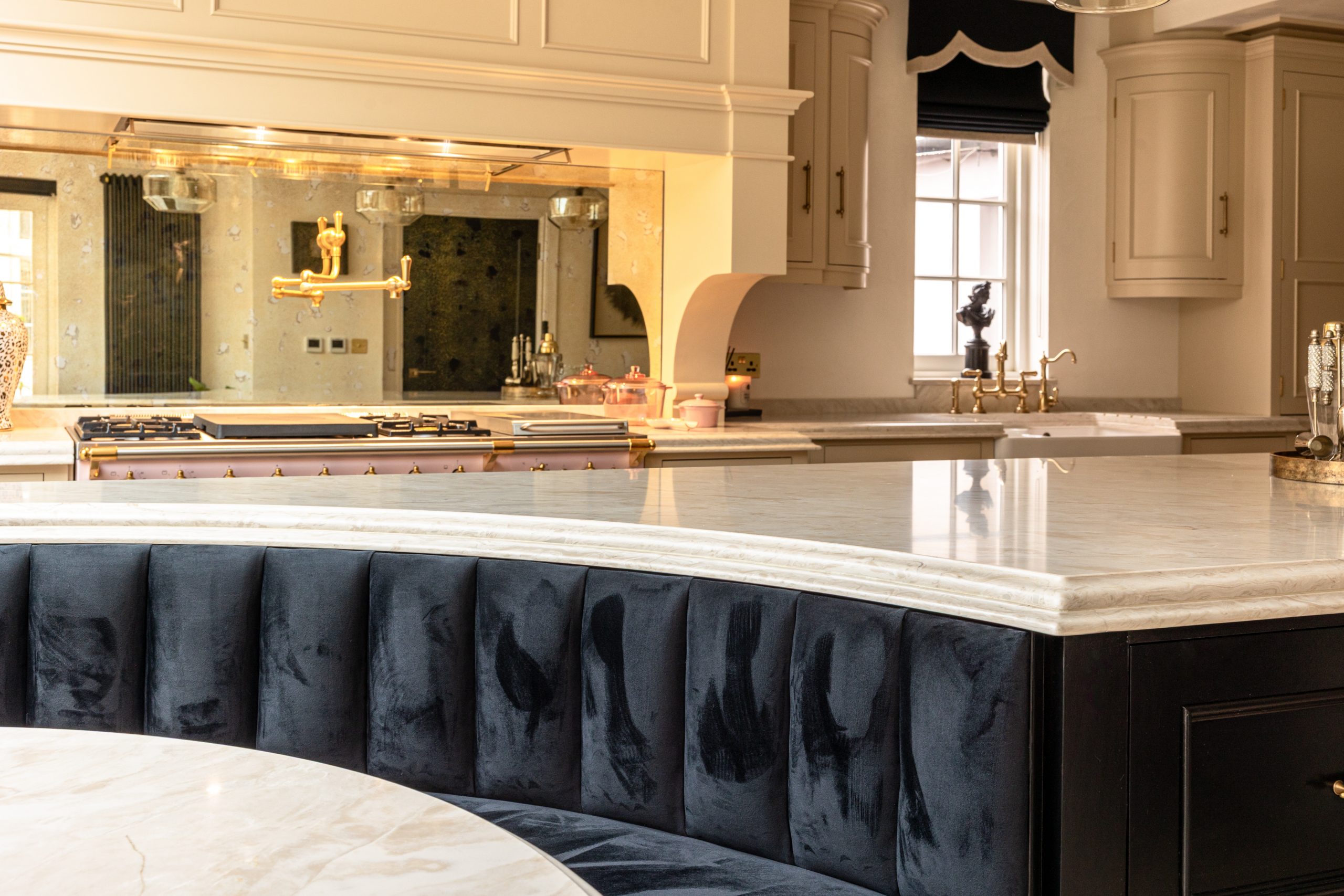 The island itself was crafted with dual purpose: bar-stool seating at one end for casual gathering, and a uniquely designed circular table with upholstered seating at the other for relaxed dining. Subtle lighting set into the coving bathes the room in a gentle glow, allowing the kitchen’s details and textures to come to life, especially after dark.